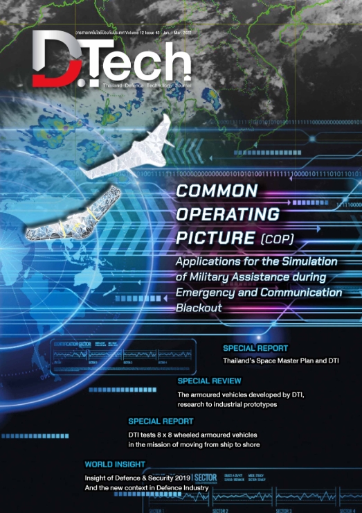 | Keywords: | DTech วารสารเทคโนโลยีป้องกันประเทศ Thailand’s Space Master Plan and DTI / แผนแม่บทอวกาศของไทย และ DTI Common Operating Picture (COP) Applications for the Simulation of Military Assistance during Emergency and Communication Blackout โครงการประยุกต์ใช้แผนที่สถานการณ์ร่วม เพื่อจำลองภารกิจการช่วยเหลือทางทหารในสถานการณ์ฉุกเฉิน The Future of Counter-UAV Technology อนาคตของเทคโนโลยีการต่อต้านอากาศยานไร้คนขับ The armoured vehicles developed by DTI, research to industrial prototypes สทป. พัฒนายานเกราะล้อยาง จากต้นแบบวิจัยสู่ต้นแบบเชิงอุตสาหกรรม DTI tests $8 \times 8$ wheeled armoured vehicles in the mission of moving from ship to shore สทป. ทดสอบยานเกราะล้อยาง $8 \times 8$ ในภารกิจเคลื่อนที่จากเรือสู่ฝั่ง Thailand’s Defence Industry: Its History and Current Development Insight of Defence & Security 2019 and the new context in Defence Industry เจาะลึกงาน Defence & Security 2019 กับบริบทใหม่ในอุตสาหกรรมป้องกันประเทศ |