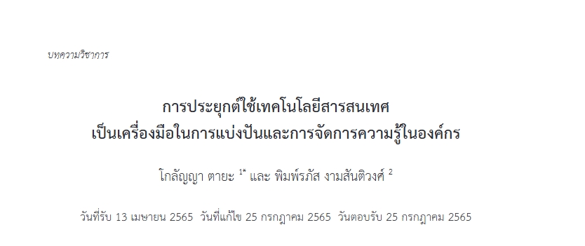 | Title: | การประยุกต์ใช้เทคโนโลยีสารสนเทศเป็นเครื่องมือในการแบ่งปันและการจัดการความรู้ในองค์กร |