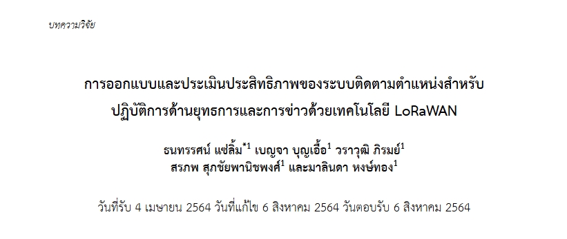 | Title: | การออกแบบและประเมินประสิทธิภาพของระบบติดตามตำแหน่งสำหรับปฏิบัติการด้านยุทธการและการข่าวด้วยเทคโนโลยี LoRaWAN |