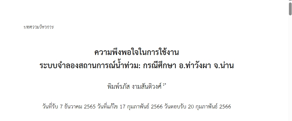 | Title: | ความพึงพอใจในการใช้งานระบบจำลองสถานการณ์น้ำท่วม: กรณีศึกษา อ.ท่าวังผา จ.น่าน |