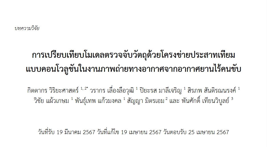 | Title: | การเปรียบเทียบโมเดลตรวจจับวัตถุด้วยโครงข่ายประสาทเทียมแบบคอนโวลูชันในงานภาพถ่ายทางอากาศจากอากาศยานไร้คนขับ |