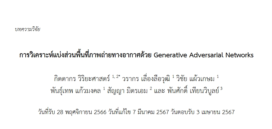 | Title: | การวิเคราะห์แบ่งส่วนพื้นที่ภาพถ่ายทางอากาศด้วย Generative Adversarial Networks |