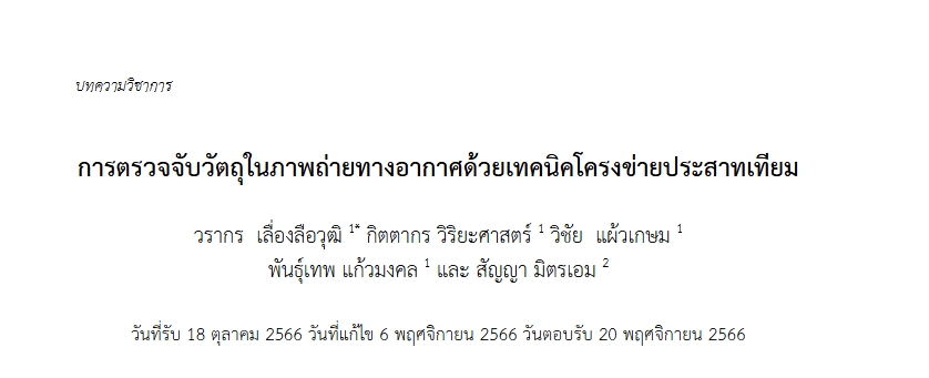 | Title: | การตรวจจับวัตถุในภาพถ่ายทางอากาศด้วยเทคนิคโครงข่ายประสาทเทียม |