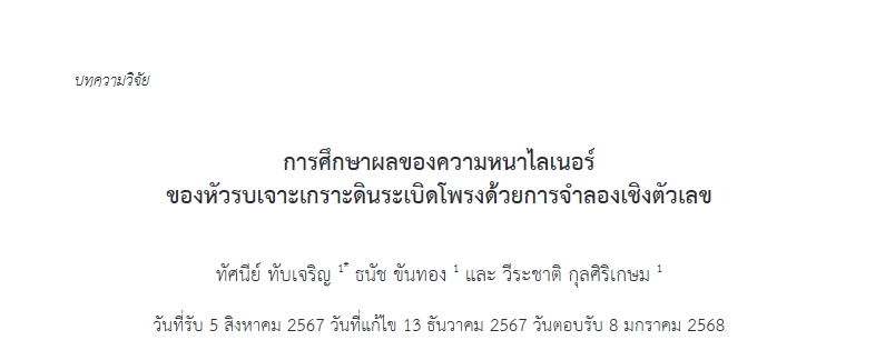 | Title: | การศึกษาผลของความหนาไลเนอร์ของหัวรบเจาะเกราะดินระเบิดโพรงด้วยการจำลองเชิงตัวเลข |