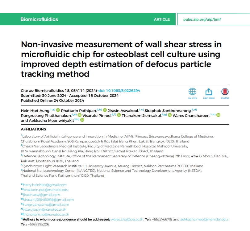 | Title: | Non-invasive measurement of wall shear stress in microfluidic chip for osteoblast cell culture using improved depth estimation of defocus particle tracking method |